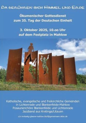 35 Jahre ist das nun her. Und für die Kirchengemeinden in Blankenfelde-Mahlow und im benachbarten Berlin-Lichtenrade Grund genug, wieder zu einem ökumenischen Gottesdienst einzuladen, in diesem Jahr auf den Festplatz nach Mahlow. Beginn ist am 3. Oktober um 10.00 Uhr.