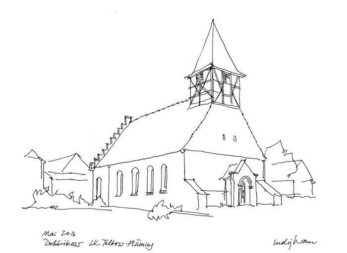Die Kirchen-Zeichnung stammt von Ludwig Krause. In Sachsen aufgewachsen studierte er nach einer Lehre als Ziegeleifacharbeiter Stadtplanung in Cottbus und Weimar, arbeitete als Stadtplaner im damaligen Bezirk Rostock und wurde Wissenschaftlicher Mitarbeiter im Institut für Städtebau und Architektur (ISA) an der Bauakademie der DDR in Berlin. Im Jahre 1990 wurde er Institutsdirektor und gründete, gemäß Einigungsvertrag, im Jahre 1991 das Leibnizinstitut für Regionalentwicklung und Strukturplanung (IRS) mit Sitz in Erkner.