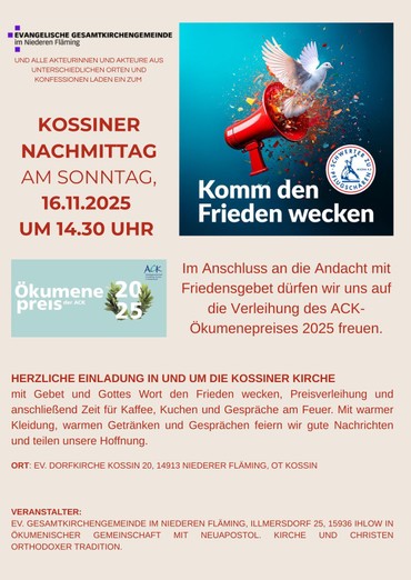 Es ist eine kleine Sensation und doch sehr verdient: Für ihr gemeindeübergreifendes, verbindendes, und friedensstiftendes Engagement erhält Kossin, eines der kleinsten Dörfer im Kirchenkreis (Ev. Gesamtkirchengemeinde im Niederen Fläming), in diesem Jahr den mit 2000 Euro dotierten Hauptpreis der ACK.