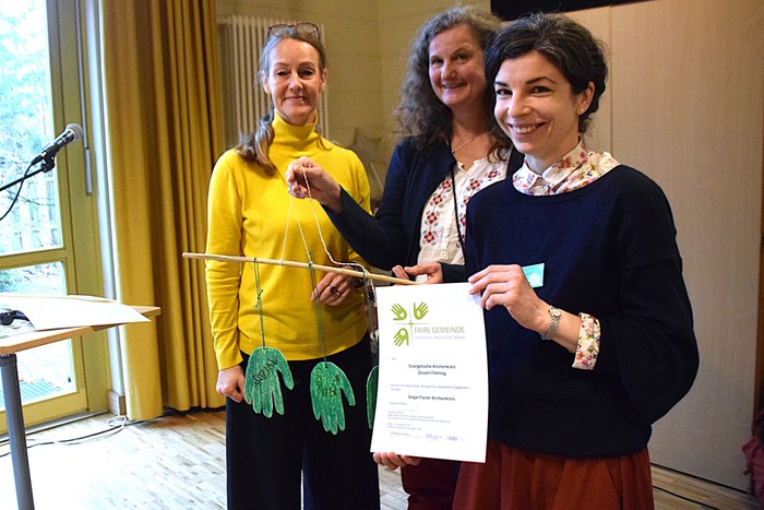Pfn. Barbara Neubert, Kirchenkreis-Fairnessbeauftragte Annette Petzold und Präses Miriam Wojakowska mit Urkunde