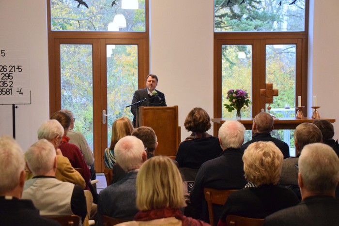 Diese aus dem christlichen Glauben gewonnene Zuversicht klang dann auch im an den Gottesdienst anschließenden Vortrag und Gespräch an. In fünf Thesen skizzierte der Kandidat, wie er sich die Zukunft des Kirchenkreises in fünf Jahren vorstellt. "Unsere Kirche wird 2030 unfertig und unabgeschlossen sein", kleiner aber auch konzentrierter. Und genau darin lägen auch Chancen für eine sich unterstützende Dienstgemeinschaft hauptberuflich Tätiger. Und "getragen wird das kirchliche Leben auch im Jahr 2030 von Menschen, die sich mit Freude auf vielfältige Weise in und für Gemeinden ehrenamtlich engagieren". Dabei komme es darauf an, mehr projektbezogene Angebote zu machen, die den Möglichkeiten von Interessierten heute besser gerecht würden. Es komme auch darauf an, ehrenamtliche zu schulen und fachlich zu begleiten, wie es vielerorts bereits geschieht: "eine Kultur der Unterstützung für engagierte Menschen ist geschaffen und mit Leben gefüllt."