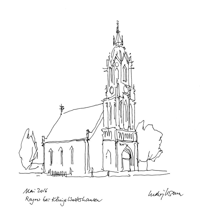 Die Kirchen-Zeichnung stammt von Ludwig Krause. In Sachsen aufgewachsen studierte er nach einer Lehre als Ziegeleifacharbeiter Stadtplanung in Cottbus und Weimar, arbeitete als Stadtplaner im damaligen Bezirk Rostock und wurde Wissenschaftlicher Mitarbeiter im Institut für Städtebau und Architektur (ISA) an der Bauakademie der DDR in Berlin. Im Jahre 1990 wurde er Institutsdirektor und gründete, gemäß Einigungsvertrag, im Jahre 1991 das Leibnizinstitut für Regionalentwicklung und Strukturplanung (IRS) mit Sitz in Erkner.