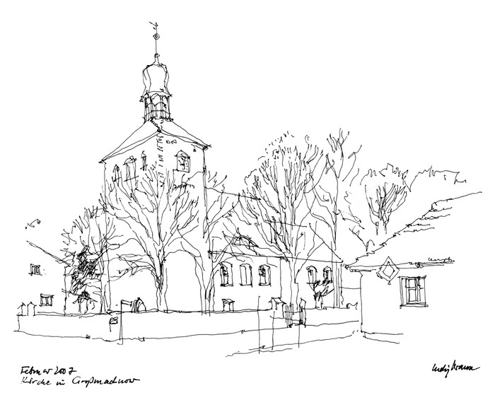 Die Kirchen-Zeichnung stammt von Ludwig Krause. In Sachsen aufgewachsen studierte er nach einer Lehre als Ziegeleifacharbeiter Stadtplanung in Cottbus und Weimar, arbeitete als Stadtplaner im damaligen Bezirk Rostock und wurde Wissenschaftlicher Mitarbeiter im Institut für Städtebau und Architektur (ISA) an der Bauakademie der DDR in Berlin. Im Jahre 1990 wurde er Institutsdirektor und gründete, gemäß Einigungsvertrag, im Jahre 1991 das Leibnizinstitut für Regionalentwicklung und Strukturplanung (IRS) mit Sitz in Erkner.
