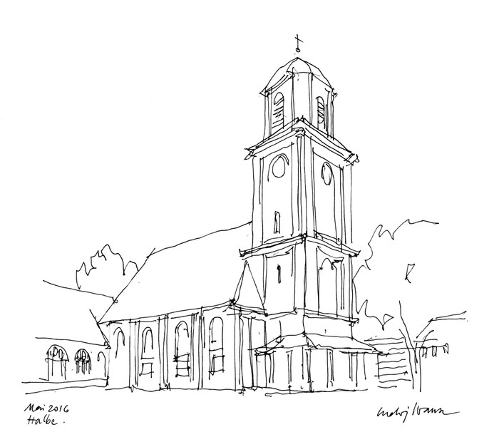 Die Kirchen-Zeichnung stammt von Ludwig Krause. In Sachsen aufgewachsen studierte er nach einer Lehre als Ziegeleifacharbeiter Stadtplanung in Cottbus und Weimar, arbeitete als Stadtplaner im damaligen Bezirk Rostock und wurde Wissenschaftlicher Mitarbeiter im Institut für Städtebau und Architektur (ISA) an der Bauakademie der DDR in Berlin. Im Jahre 1990 wurde er Institutsdirektor und gründete, gemäß Einigungsvertrag, im Jahre 1991 das Leibnizinstitut für Regionalentwicklung und Strukturplanung (IRS) mit Sitz in Erkner.
