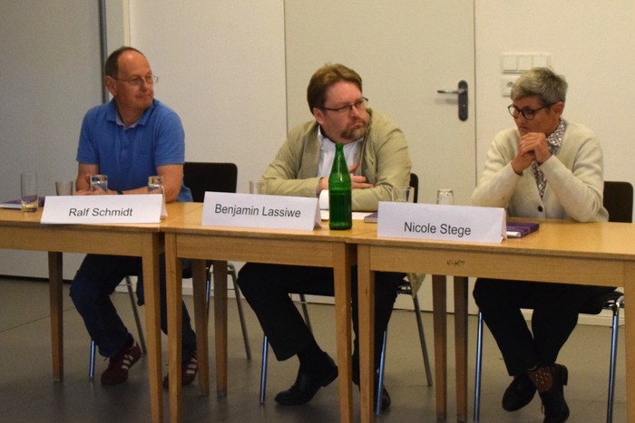 Spannend wurde es auch in der zweiten Gesprächsrunde, in der zwei Mitglieder der Evangelischen Kirchengemeinde ihre Haltungen biographisch begründeten. Nicole Stege arbeitet in der zivilen Verwaltung der Bundeswehr, ist also indirekt auch mit den Fragen der Organisation von Einsätzen der Bundeswehr befasst. Sich für den Frieden zu engagieren und gleichzeitig für eine Armee zu dienen, ist für sie kein unmittelbarer Widerspruch. Dazu beigetragen hat sicherlich auch, dass sie ursprünglich in Westdeutschland aufgewachsen ist und ihr Vater eine Bundeswehr-Laufbahn eingeschlagen hatte. Jedoch kennt auch sie Konflikte: Die Diskussionen um den Nato-Doppelbeschluss Anfang der 1980er Jahre lösten auch bei ihr Fragen aus.