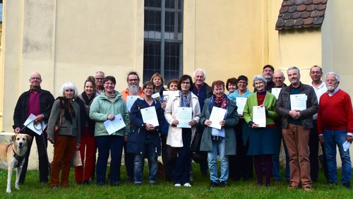 Großer Tag für die 21 Teilnehmenden des ersten Ausbildungskurses für ehrenamtliche Kirchenführer:innen im Kirchenkreis. Am Samstag, den 27.9. erhielten sie in der Dorfkirche Stülpe (Nuthe-Urstromtal) von den beiden Kursleitenden, Annegret Gehrmann (Langengrassau, Kunstgut-Beauftragte) und Pfr. Friedemann Düring (Erwachsen Glauben) ihre Teilnahmebestätigungen ausgehändigt.